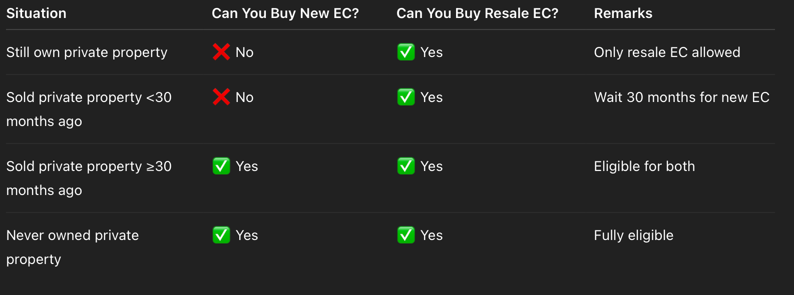 Case Study: Kelvin sold his private condo in March 2024. He can only apply for a new EC from September 2026 onward (30 months after sale). However, he can buy a resale EC immediately after selling if he finds a suitable one on the open market.
