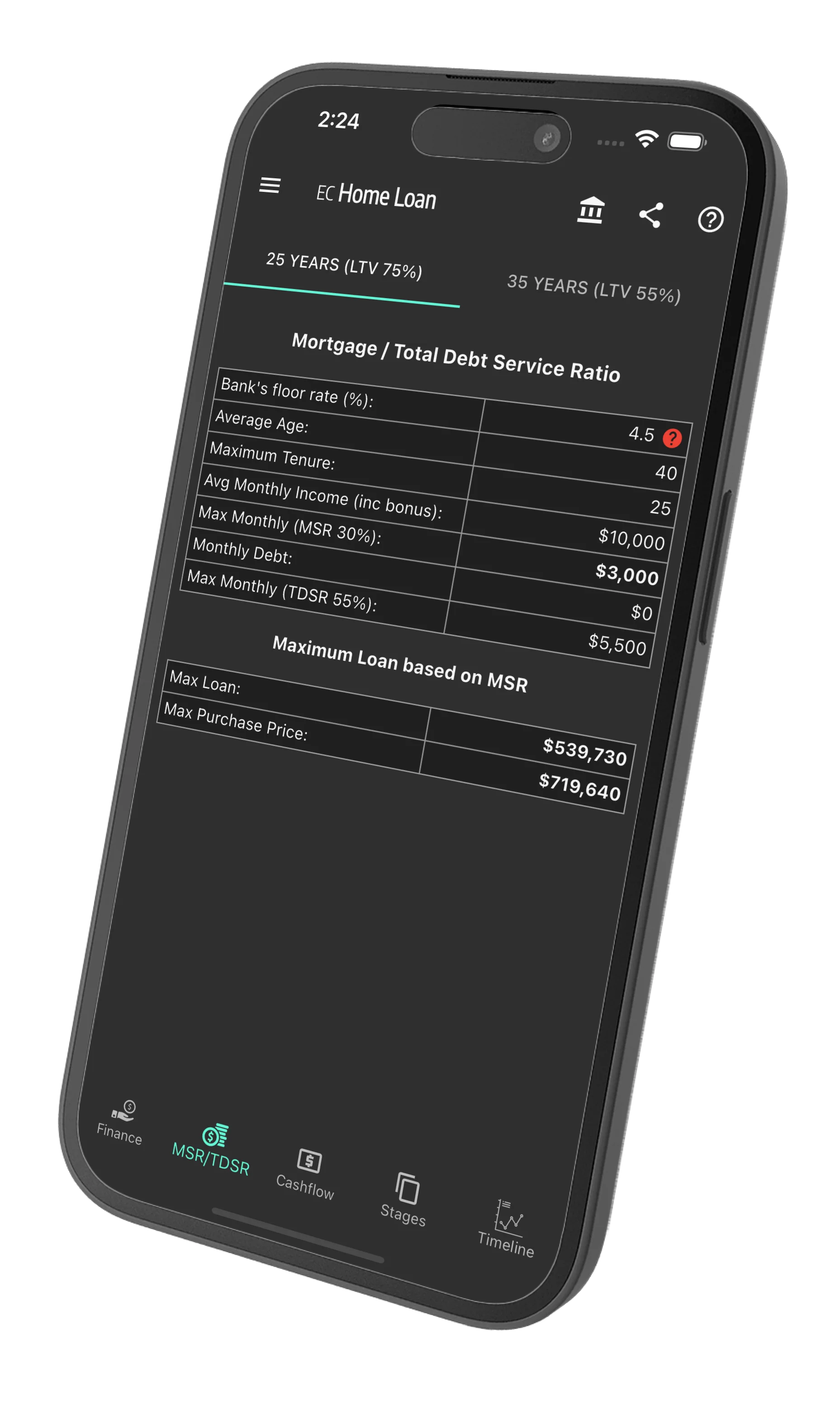 Swipe or tap to view how much loan you can take using MSR or TDSR
