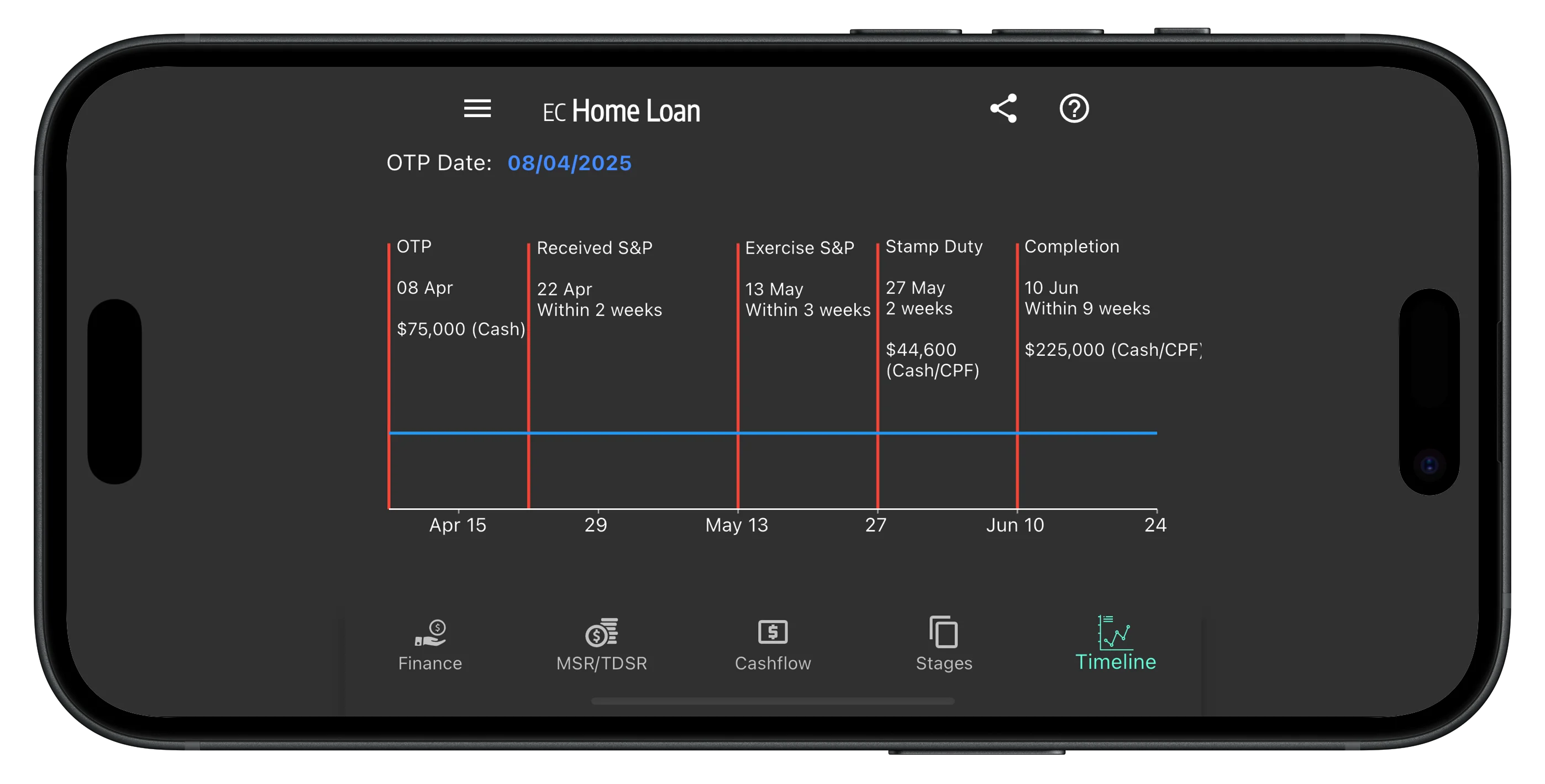 This feature provides a stage-by-stage breakdown of your payment obligations throughout the home buying journey — from option fee to key collection.